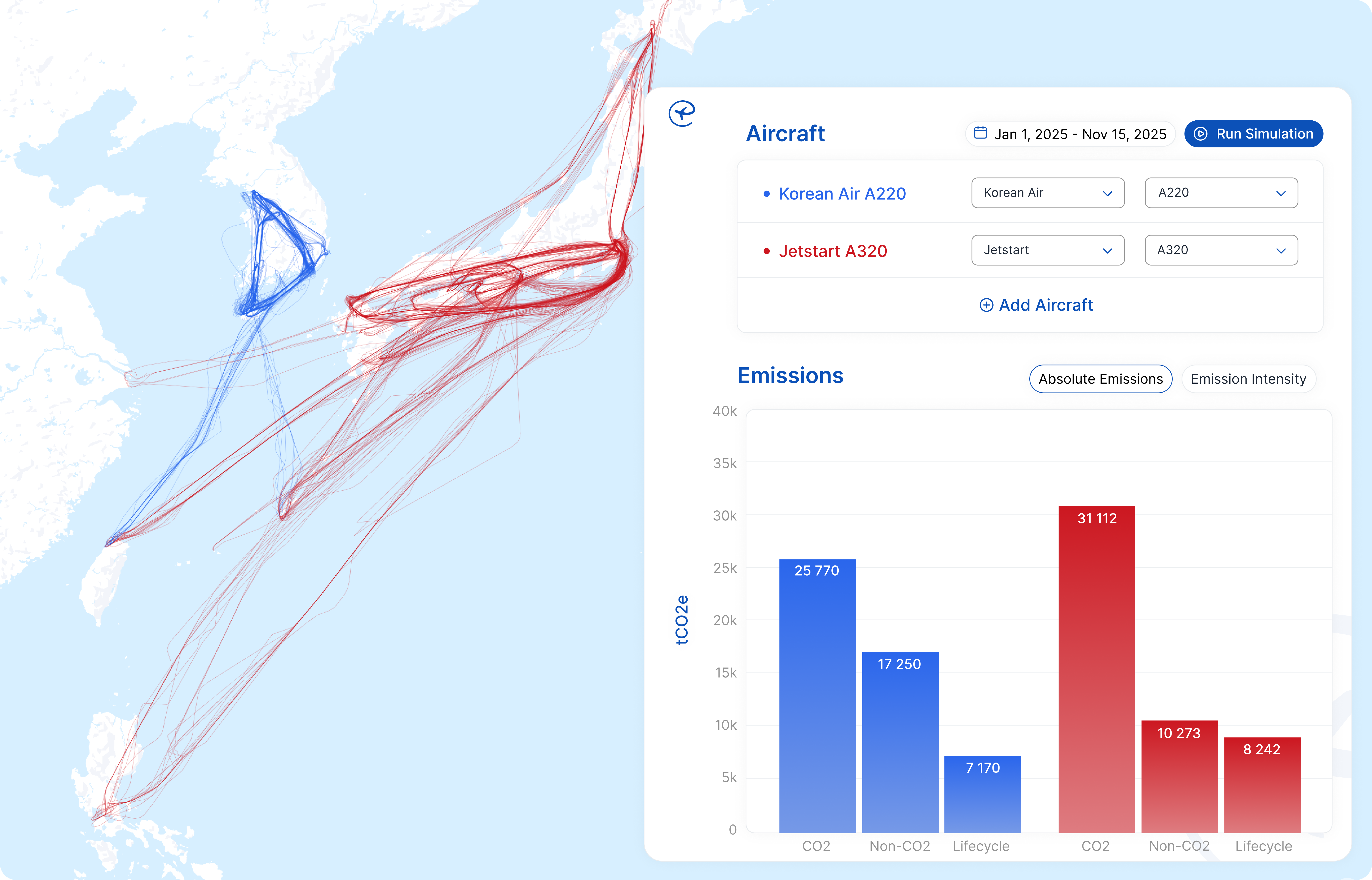 Compare your aircraft’s climate impact against in-service models across different routes,geographies, and operating conditions. Use our benchmarking tools to strengthen yourcommercial proposals and highlight the performance gains of your next-gen technologies.