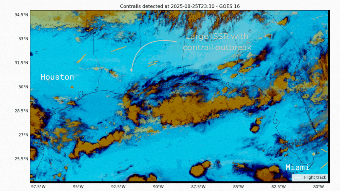 Persistent warming contrail formation is a result of several specificities: atmospheric conditions called Ice Super Saturated Regions (ISSRs), cruise altitudes, the amount of soot emitted via engine combustion, and the particulate matter as a function of fuel properties. ISSRs are cold, humid regions in the atmosphere and not all flights fly through them. That's why adjusting flight profiles of only certain flights can have significant climate savings.