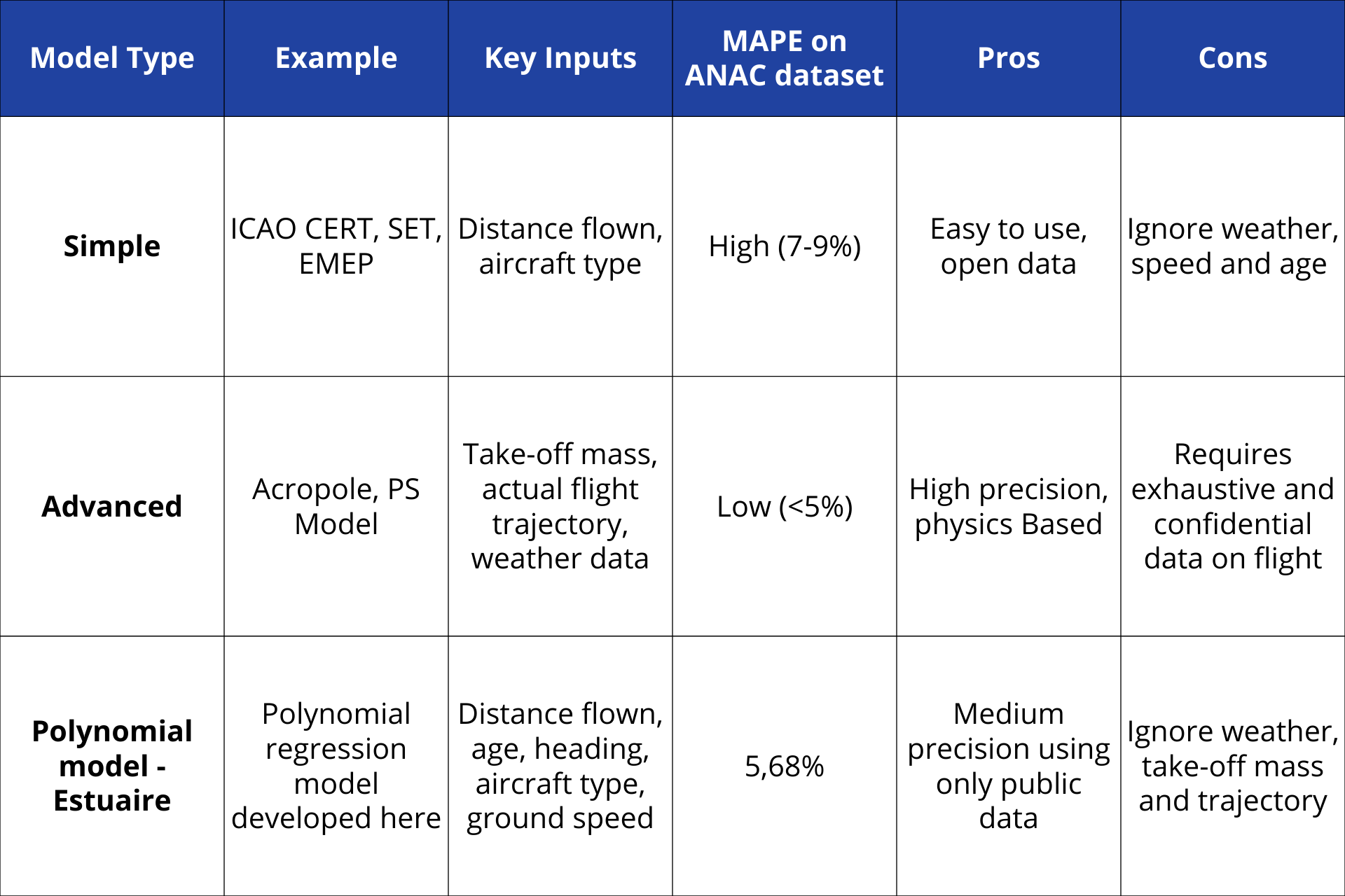 To bridge this gap between advanced flight physics models and simple distance-based models, Estuaire developed a Polynomial Regression model based on the main drivers of fuel burn : aircraft type, distance flown, average ground speed, aircraft age and heading. This model was trained on public flight data from the Brazilian National Civil Aviation Agency (ANAC).