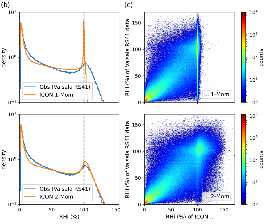 Until now, the primary industry standard has been ECMWF HRES (European Centre for Medium-Range Weather Forecasts High-Resolution System), a robust weather model. However, like most models, there is considerable bias in the likelihood of encountering ISSRs at commercial aircraft cruise altitudes, see figure 1. Up to now, this has been dealt with by using corrections, see figure 2, where it can be seen that even reanalysis data suffers from similar biases as forecast data. Relative humidity in the upper troposphere has simply not been the target metric most weather models were designed for, however many institutions are now looking to improve on this metric. To our knowledge, DWD is the first one to provide a forecast model with 2 moment cloud ice microphysics into operation. This forecast offers better representation of ice supersaturation than previous versions, removing biases compared to observations.