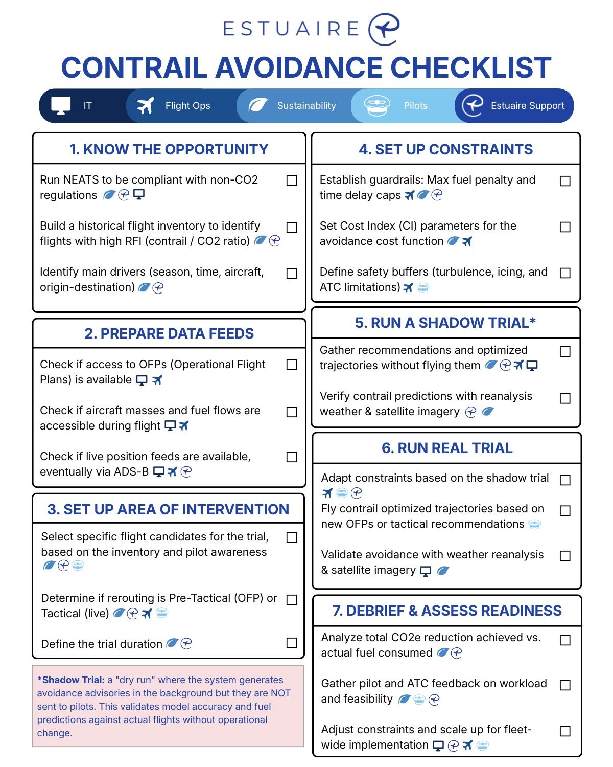 After running trials with multiple airlines, we've seen the same challenges come up every time. That's why we built this practical checklist, to make it as easy as possible for airlines to start this journey. It walks through the 7 phases that make contrail avoidance operational: data validation, constraint setting, shadow trials, real flights, and debrief.